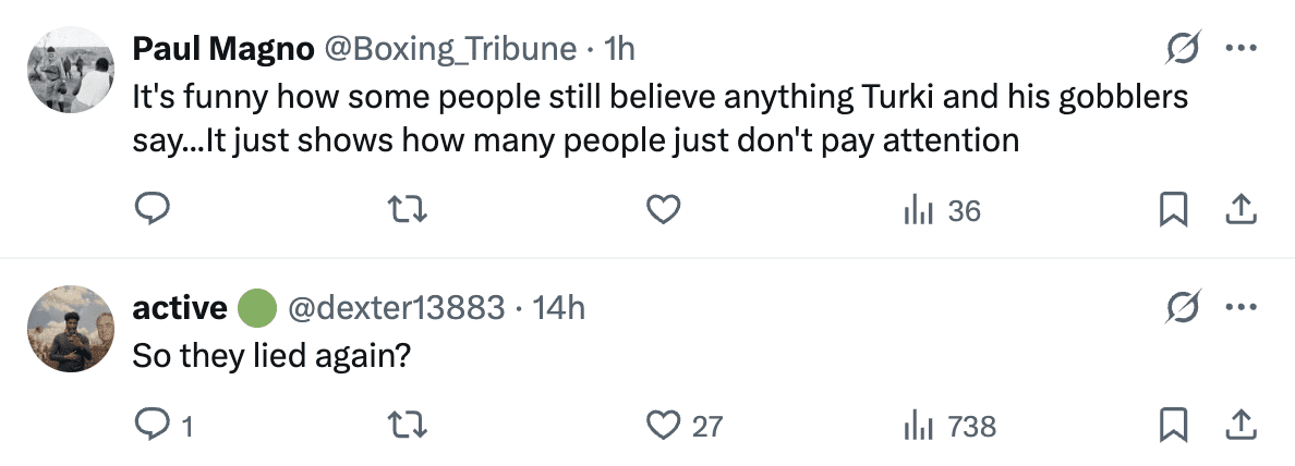 “Great meeting with my brother Shay, CEO of DAZN. We have big vision to grow boxing and decide: No More Pay-Per-View. Starting with our @ringmagazine show in November, all Riyadh Season & The Ring events will be free to DAZN subscribers. The PPV model has damaged boxing, and we will no longer support it. We are with the fight fans,” Turki Alalshikh said