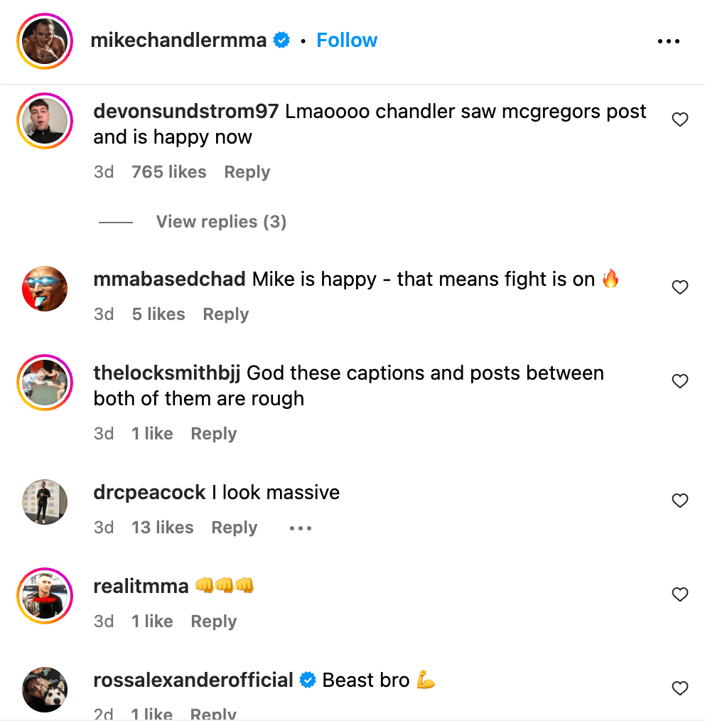 McGregor and Chandler’s rivalry has been brewing since their days as rival coaches on the TUF 31 series. Chandler has been putting in the work to give himself the best shot at a win. The following image show Chandler doing some weight training as he shows off his shredded look. The post was captioned by the following comments: “When the pain is your pleasure and you’ve never worked a day in your life. Walk On. See you at the top.”