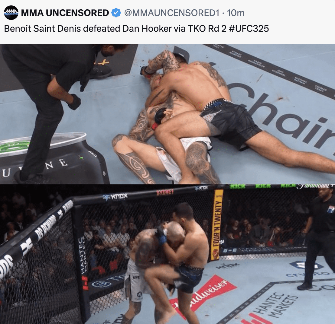 Benoît Saint Denis stopped Dan Hooker in the second round at UFC 325, as you can see how the fight played out live.