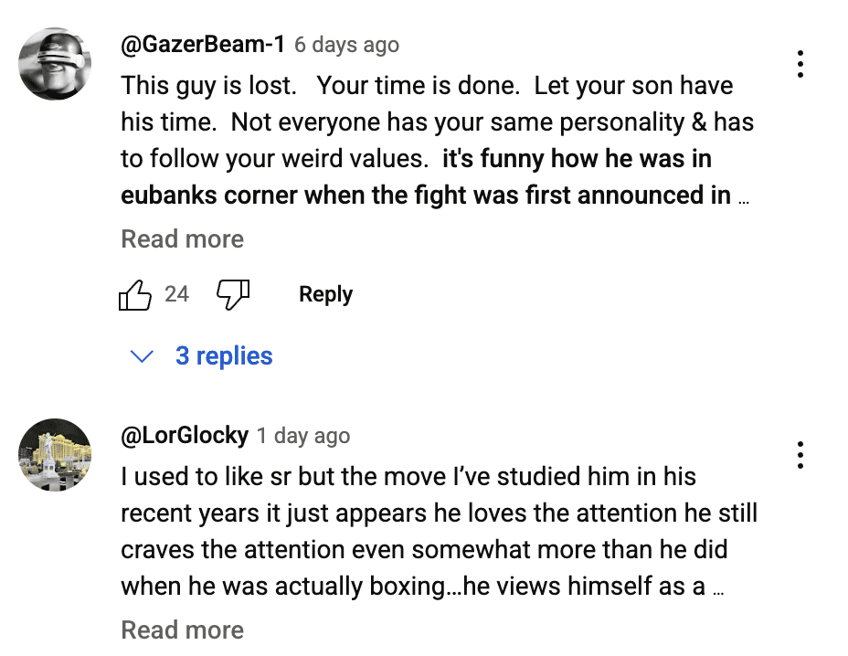Sr. has also stated that he will not attend this fight, as it would be seen as him endorsing it. And if something untoward were to happen, it is clear that Sr. would not be able to deal with the repercussions. However, others have argued that Eubank Sr. should attend to support his son. Their relationship is not the best, with Eubank Jr. saying he does not speak to his father.
