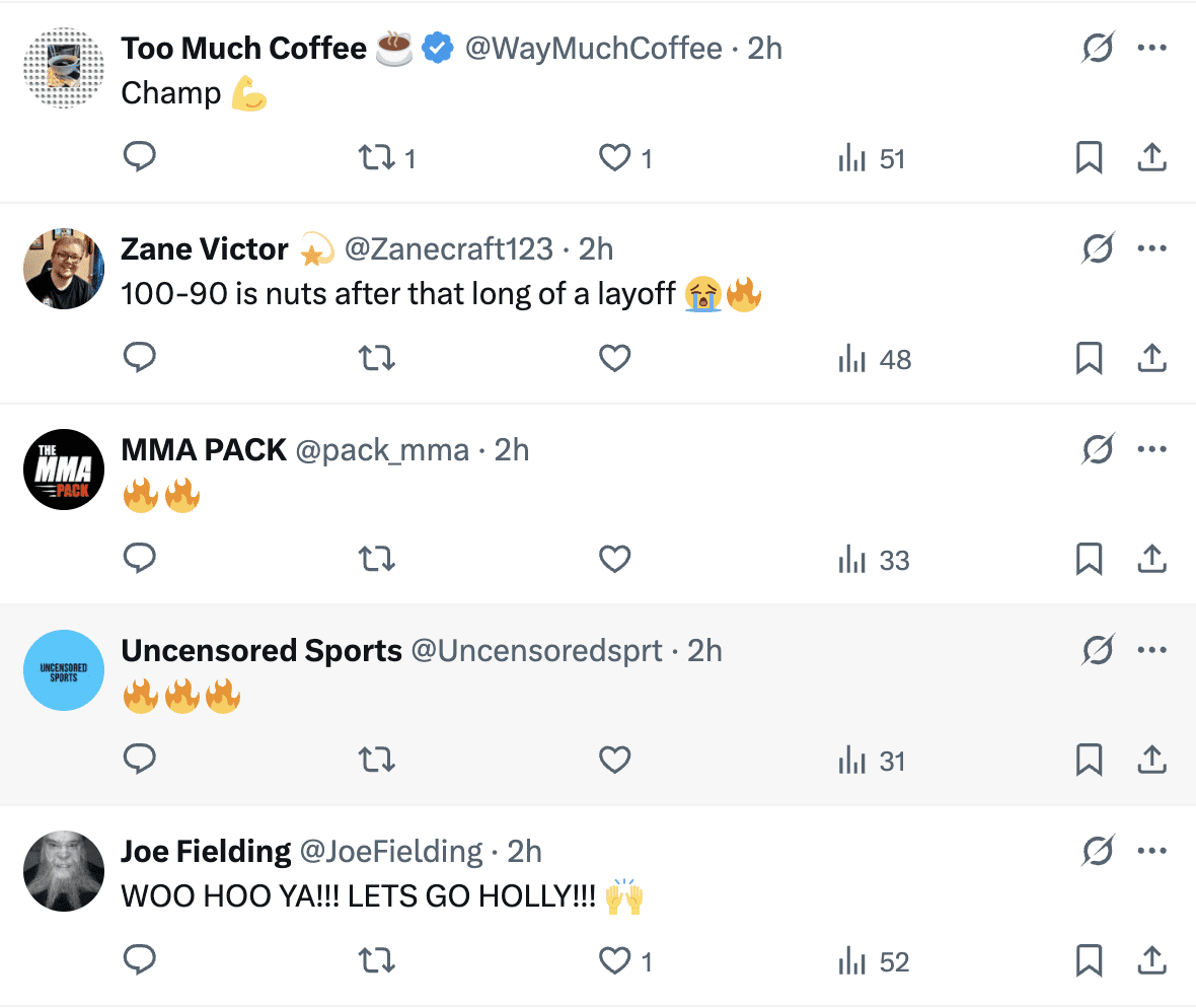 Holm secured a one-sided unanimous decision win on the Jake Paul vs. Julio Cesar Chavez Jr. card. Holm had not had a boxing fight since 2013 when she faced Mary McGee to secure a unanimous decision win. Holm dominated the fight early on, landing her shots while staying out of range. Despite Holm being much older at 43, she was able to hurt the more youthful 30-year-old Vega.