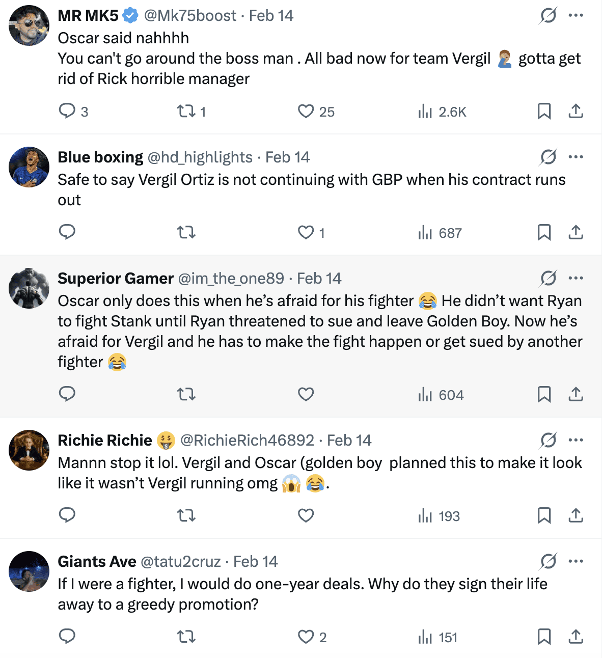 “We are aware of the lawsuit. Unfortunately, Vergil is getting bad advice from his lawyer and manager, who have repeatedly violated the contract. We will aggressively defend this lawsuit and enforce our rights. We are confident a judge will agree that our contract is valid and Vergil and his team are in breach,” De La Hoya stated