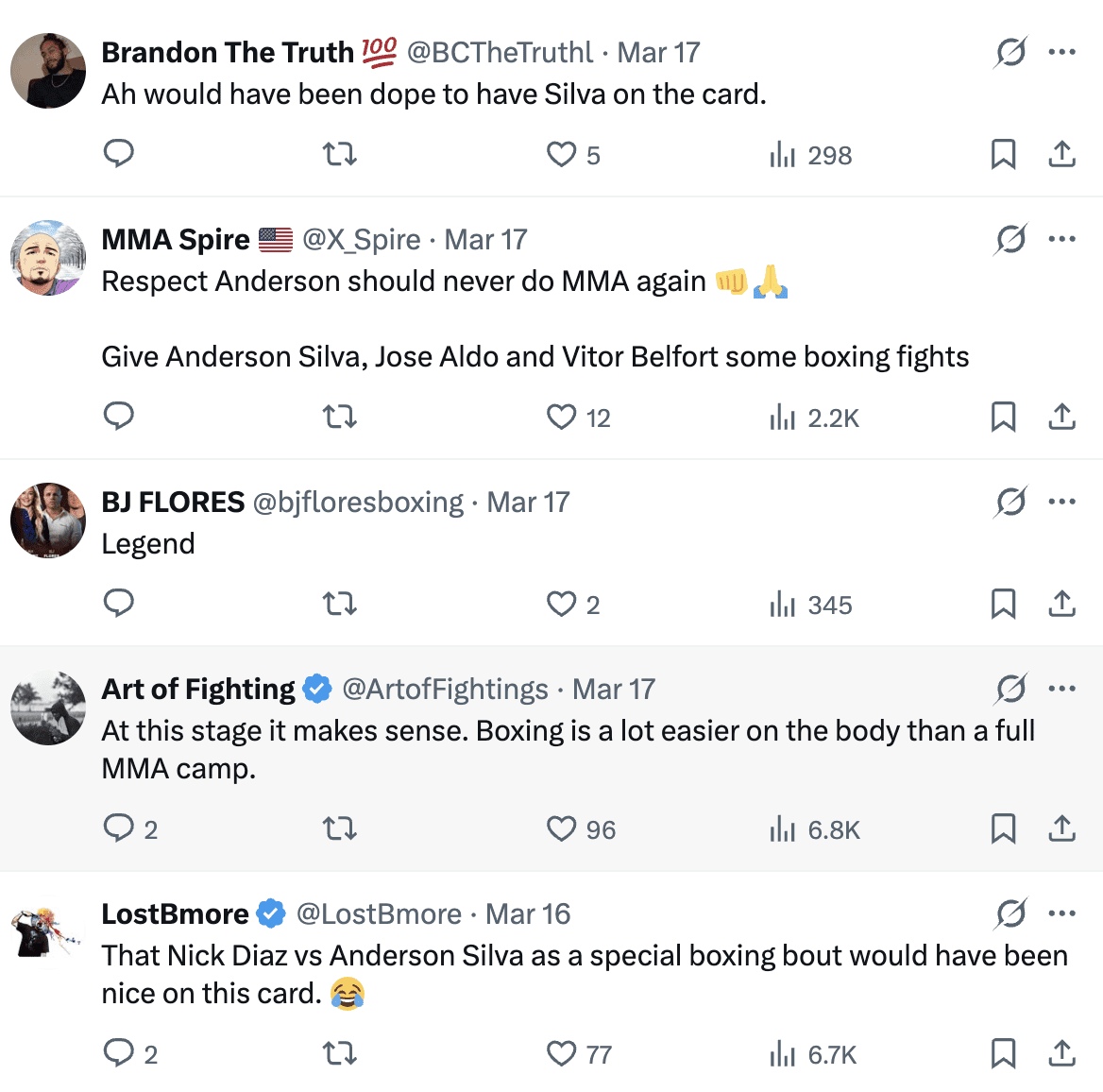"Nakisa [Bidarian] invited me to come to fight MMA or kickboxing. But because I’m in this process now [of becoming a police officer] to study, to keep my mind work on the one thing, I just say, ‘Oh, I can’t this time.’ But when I finish the whole thing, probably I have one or two more fights, only boxing. I’m not have a mind anymore to train in MMA, it’s just too hard for me to [come] back to train MMA. Of course, I train jiu jitsu every day. I train in boxing two days a week. But MMA no, not anymore," Silva said