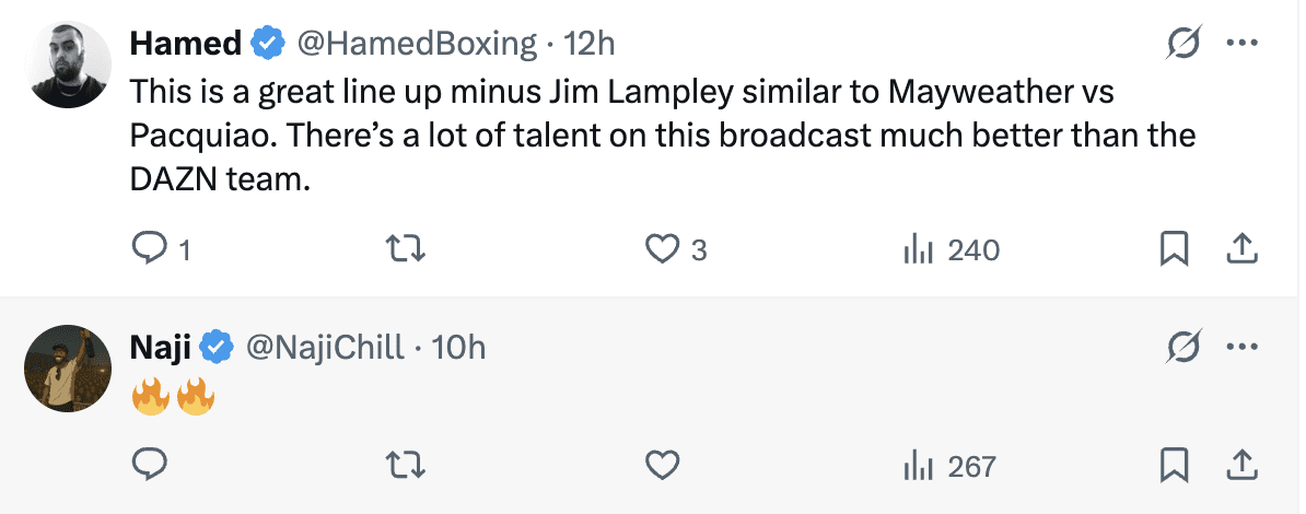 Ringside reporters Jim Gray and Heidi Androl will provide analysis and interviews, while Skipper Kelp is an unofficial judge. Mario Lopez, Antonio Tarver, and journalists Mark Kriegel and Mike Coppinger will also feature. Boxing fans had plenty to say.