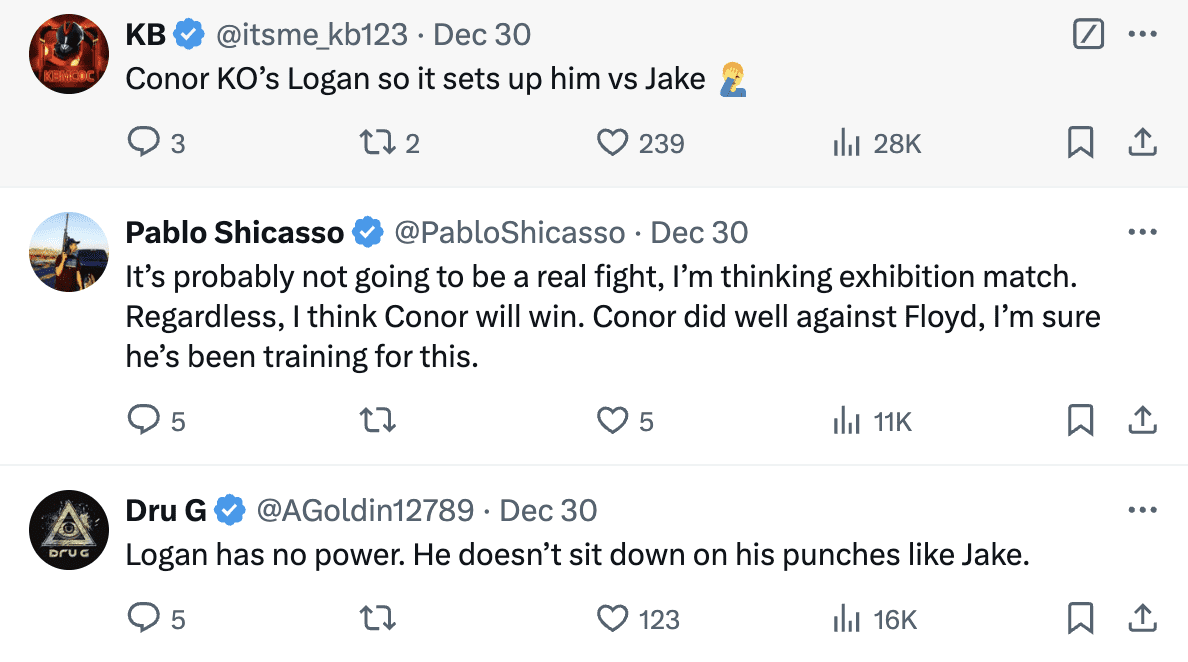 Logan also shared training footage of him in the boxing gym as he hit the heavy bag. Logan has more boxing experience than McGregor, having had four fights. He faced KSI two times, Mayweather and Dillon Danis. But Logan’s focus has recently been on WWE. McGregor’s only boxing fight was in 2017 against Floyd Mayweather when the latter stopped him in the 10th round. That could give Logan an advantage. But the following training shows him hitting the heavy bag very slowly, with fans unconvinced.