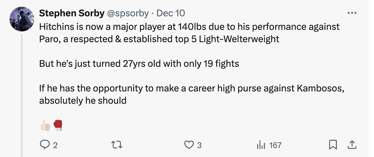 Hitchins is coming off the best win of his career. He entered the Liam Paro fight with plenty to prove. He had just secured an unconvincing victory against Gustavo Lemos. Hitchins went the distance, whereas Lemos would get knocked out in just round two against Keyshawn Davis in his next fight. But Hitchins proved his critics wrong to beat Paro and claim the IBF Junior Welterweight Title. Hitchins can now focus on securing the mega fight.