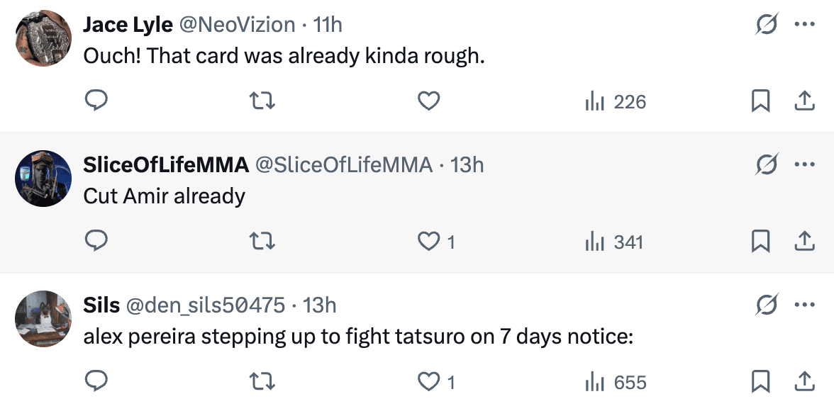 However, it appears the match-up won’t happen. Taira hinted that something may be amiss on his social media: “When one door closes, another opens. Let’s go have a fire.” Meanwhile, Albazi had this to say: “As fight fans, do you prefer the arenas or the UFC Apex? As a fighter, I definitely like the atmosphere and hearing of the crowd in the arenas. Makes me feel like a gladiator.”