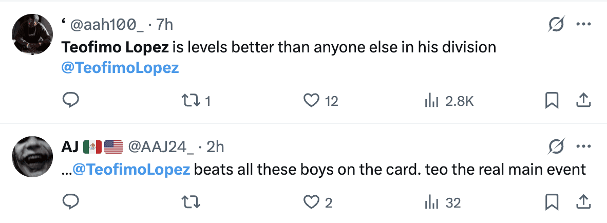 He did find some success in round six. Barboza connected with a right hand that cut Teo near his left eye. That woke Lopez up, who landed a left in the seventh. Teo was now hitting Barboza at will, without the need to over-commit himself. Barboza had to find something out of the ordinary to turn the course of this fight. He could not, as Teo coasted to a decision win. After his win, Teo said he wanted the WBA, IBF, and Ring Magazine Welterweight Champion Jaron Ennis next.
