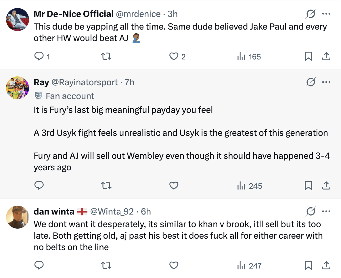“It’s been a massive rivalry for over 10 years. The British public is still baying for it. They still want it desperately. Even if we had a 200,000-seat stadium, we’d sell out 10 times. That’s how big it is over here. I do think I could beat him at any time, whether he was 25, 35, or 95. If everything goes well in this fight on Saturday night, then that’s the fight we’re looking to make next,” Fury said